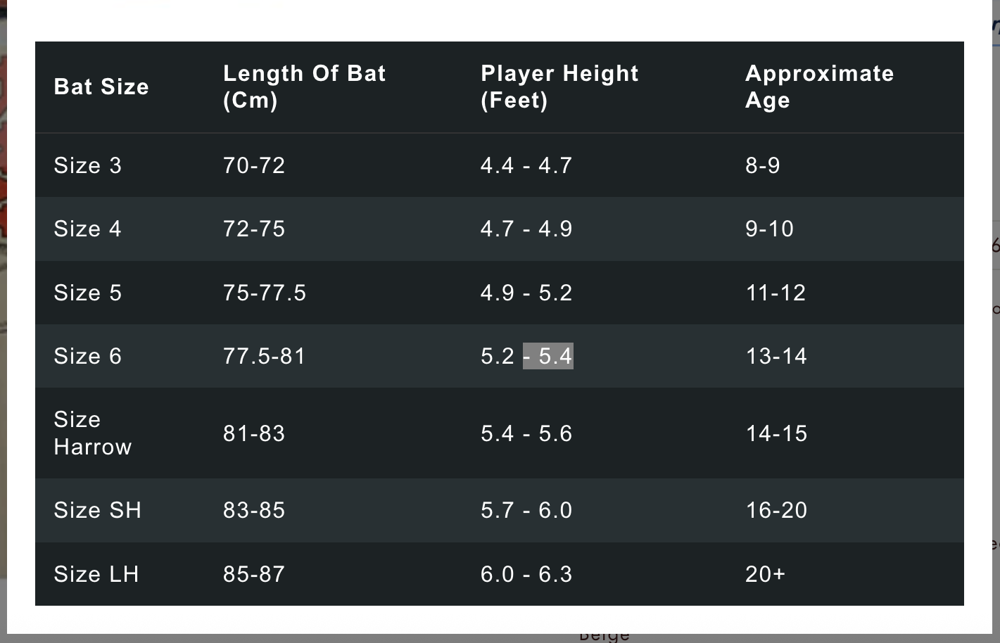 Bat Size | Length (cm) | Player Height (ft) | Approx. Age | |